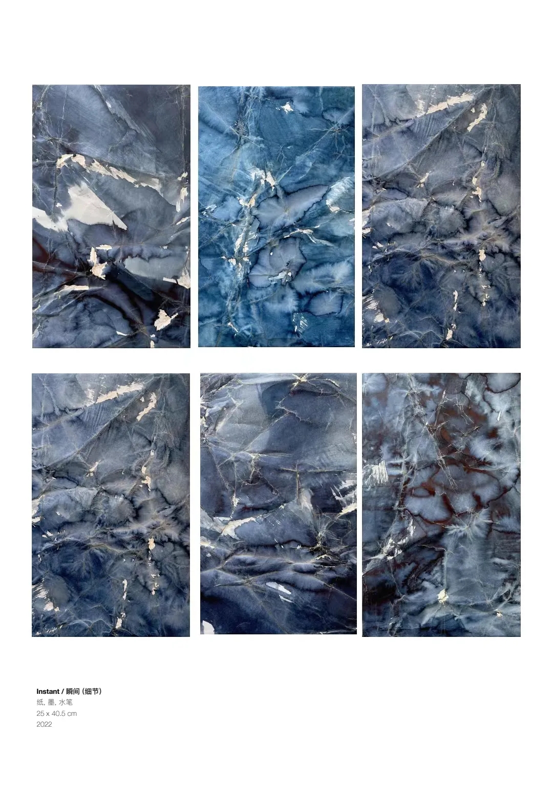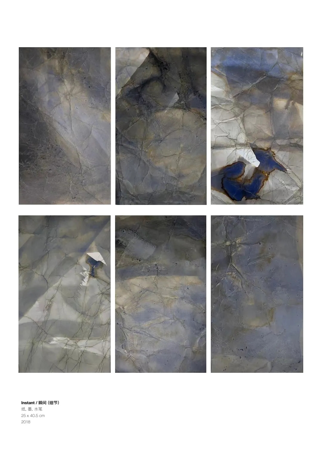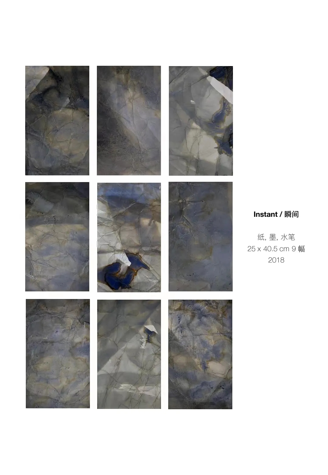 张凯惠的作品以“瞬间”为主题,她将纸张进行随意性褶压,并以单色墨汁涂染,使两者在瞬间形成错综复杂的痕迹,再对纸上自然形成的皱褶进行细致勾勒,使得皱褶肌理与线条错落交织,与水墨痕迹相融相交,形成了细微且无尽的变化,模糊了边界,仿佛在瞬间触碰到了永恒。