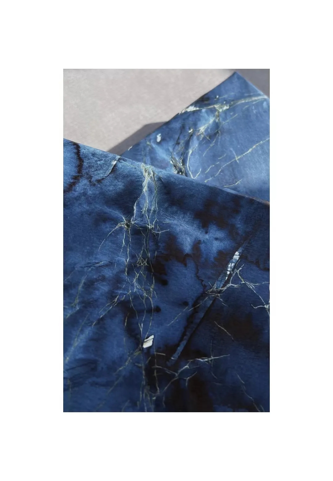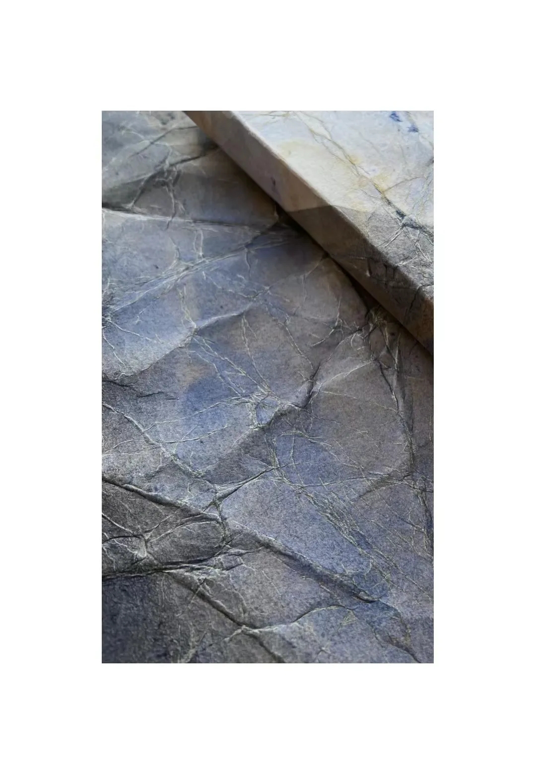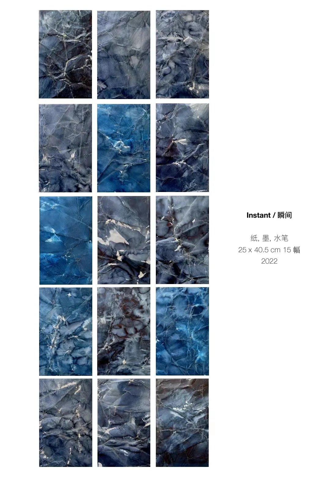 张凯惠的作品以“瞬间”为主题,她将纸张进行随意性褶压,并以单色墨汁涂染,使两者在瞬间形成错综复杂的痕迹,再对纸上自然形成的皱褶进行细致勾勒,使得皱褶肌理与线条错落交织,与水墨痕迹相融相交,形成了细微且无尽的变化,模糊了边界,仿佛在瞬间触碰到了永恒。