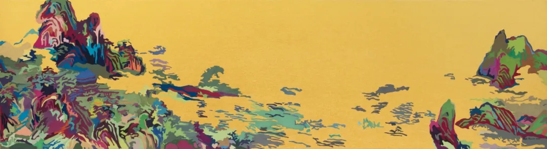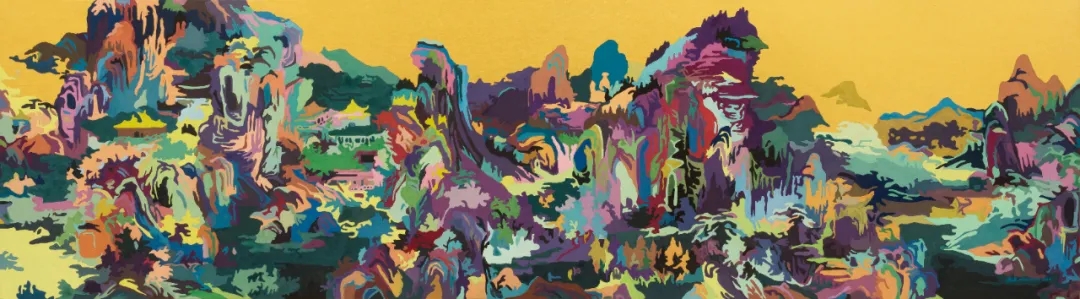 陈欣最新的“未来风景”系列作品,是艺术家在东西方艺术史里的山水风景题材创作脉络的基础之上,以当代艺术家的视角进行推进,通过“对画”的方式,对历代山水佳作进行结构性与重构,用波普和抽象表现的方式呈现出华采独具的“欣-山水”。本次《溪山访友》作品展,展出陈欣“未来风景”佳作数件,有大件巨作《楼阁图卷》,金潜纸作品《20210305惊蛰》、《20210506》,清秀灵动的纸上作品《上林图》系列4件。同时作为陈欣的山水题材多元创作的展现,一同展出艺术家被学界和媒体高度关注、报道,多种跨界的标志性缂丝媒材团扇作品数件。