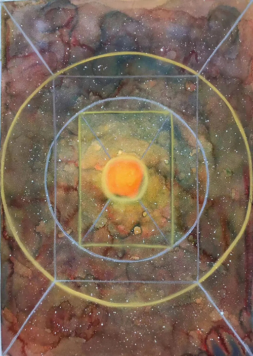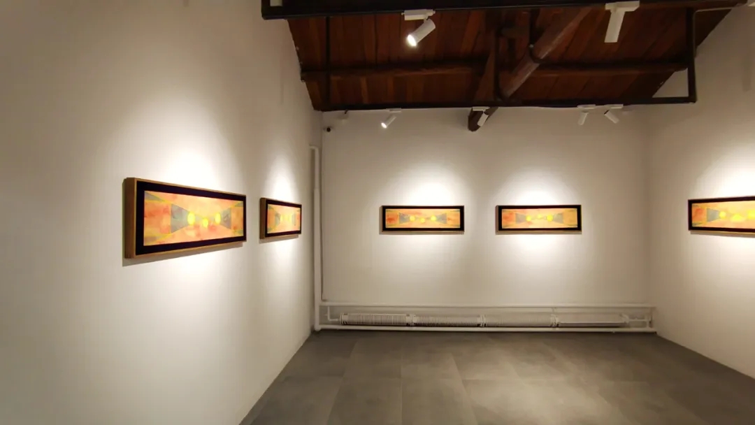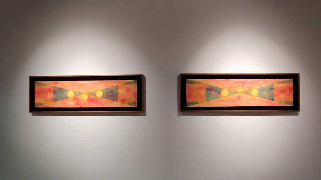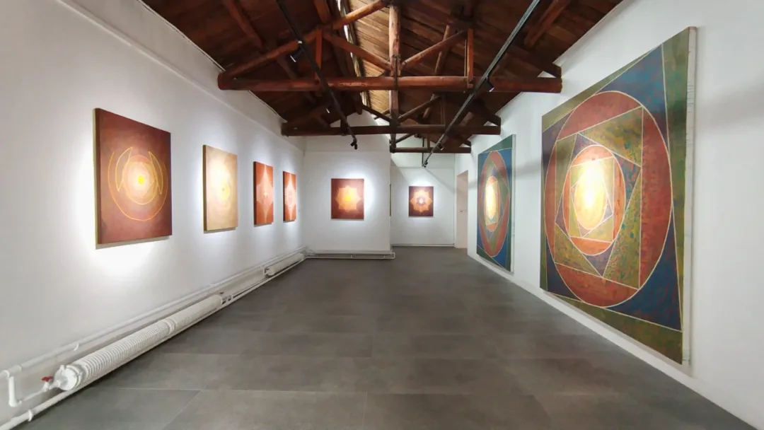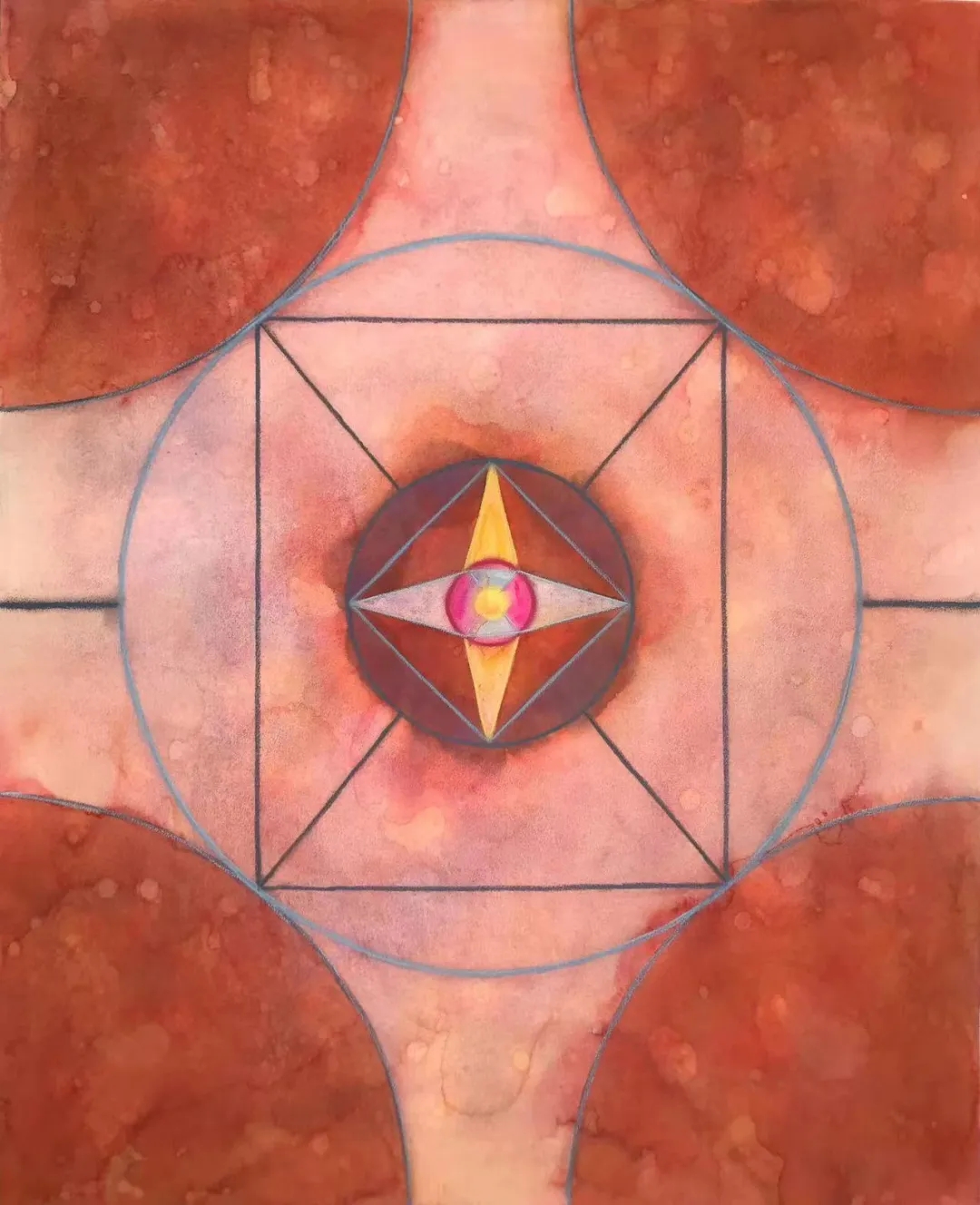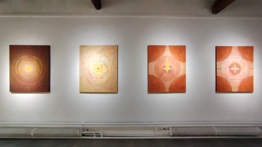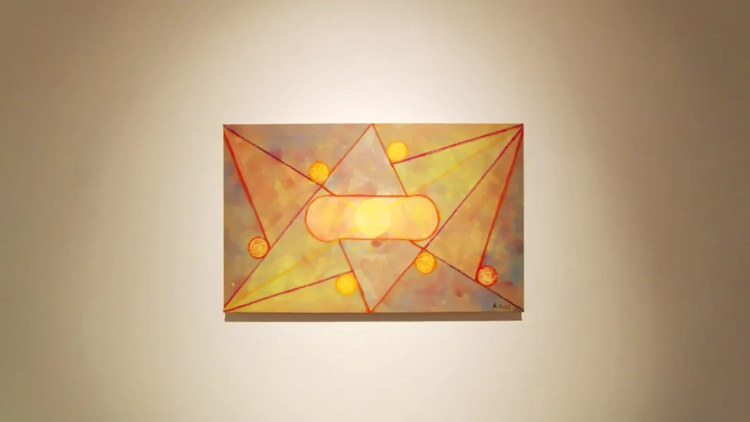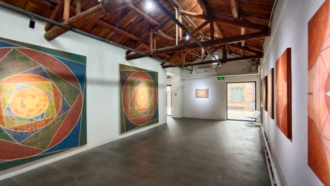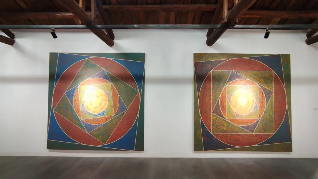 士华的《回》系列创作采用了天圆地方的宇宙观;以回字形的拓展与延伸来组织画面,通过方圆等 核心的几何形态,结合变幻莫测的色彩,让画面产生静与动,具体与虚幻之间的冲突,呈现出神秘的消失过程中的聚合形态,暗含着轮回与重生。