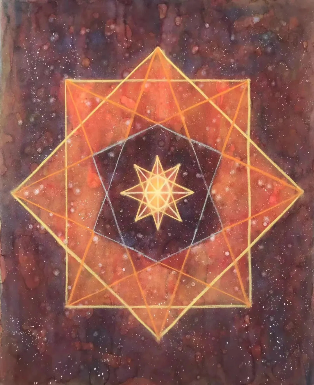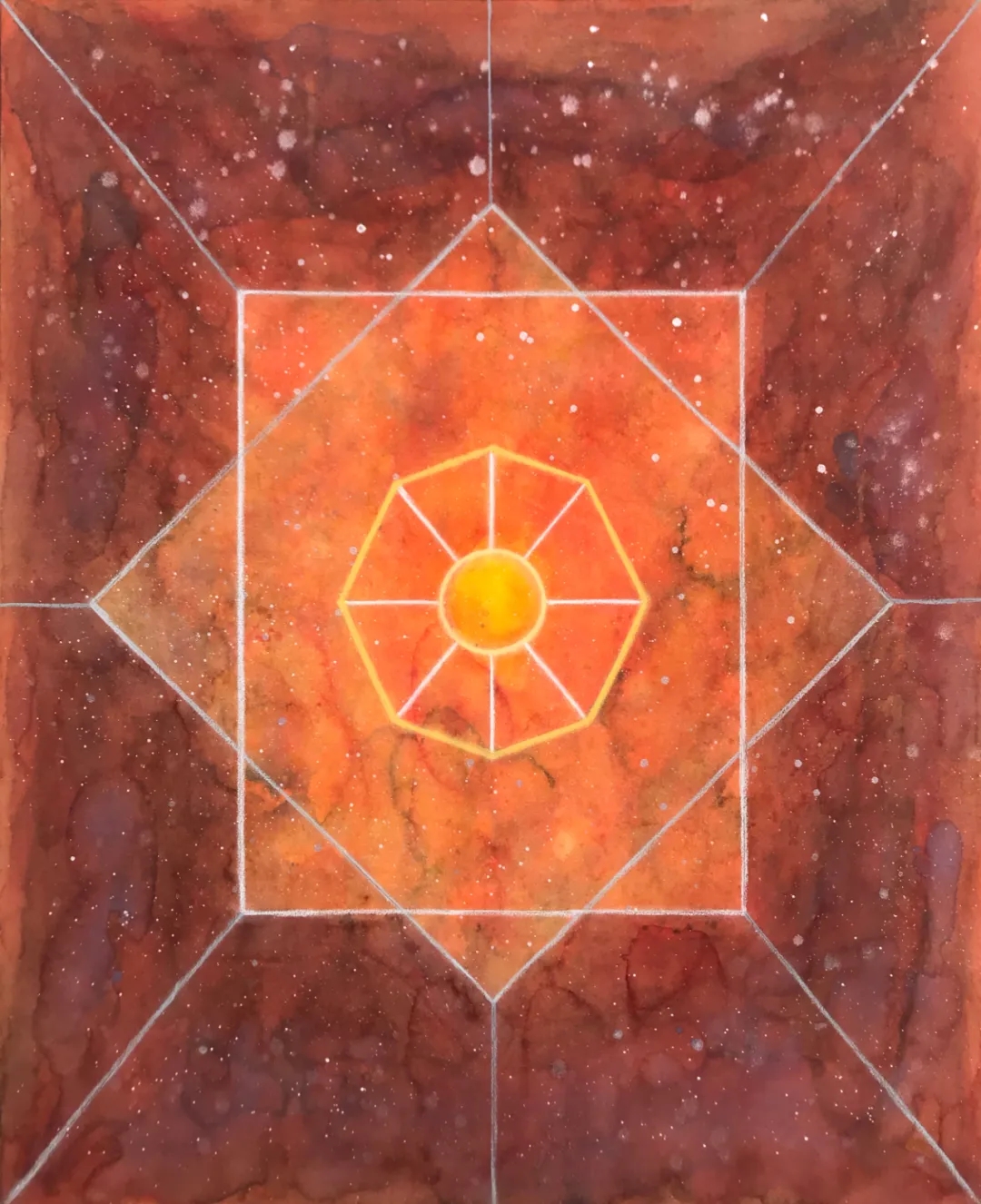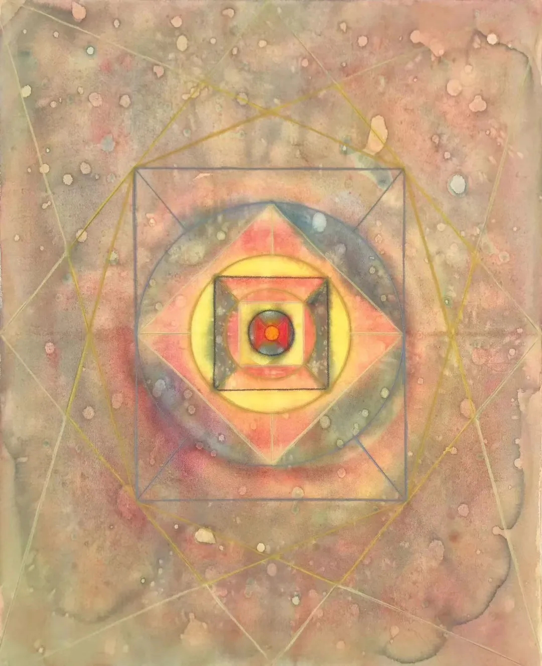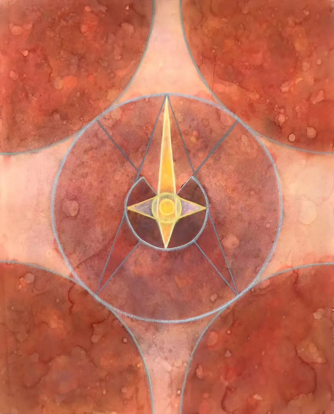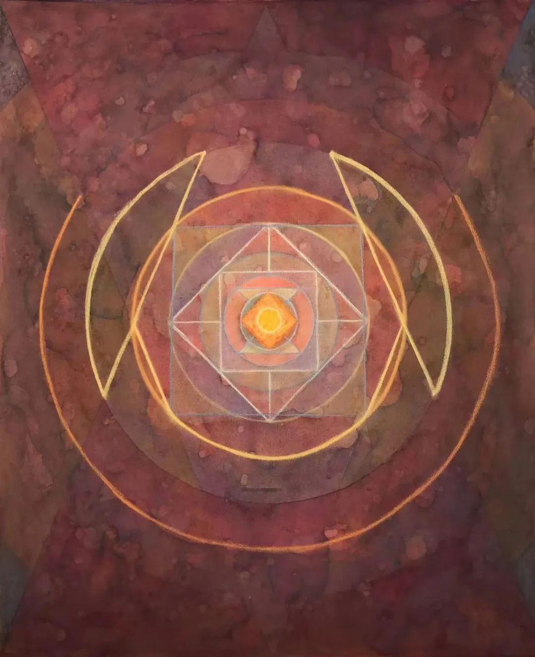 士华的《回》系列创作采用了天圆地方的宇宙观;以回字形的拓展与延伸来组织画面,通过方圆等 核心的几何形态,结合变幻莫测的色彩,让画面产生静与动,具体与虚幻之间的冲突,呈现出神秘的消失过程中的聚合形态,暗含着轮回与重生。