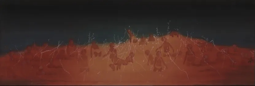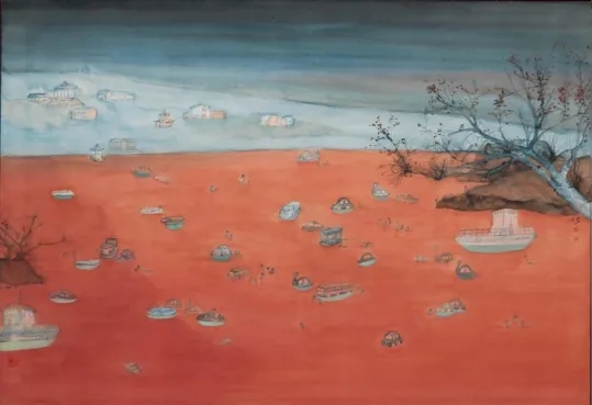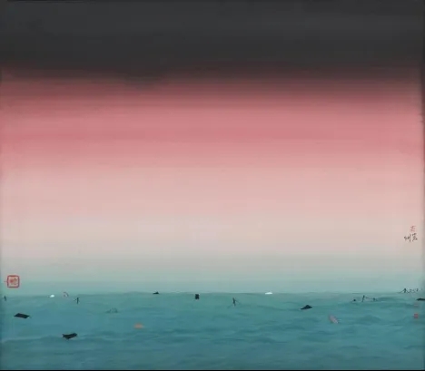 “泛泛”大概的意思是漂浮状,或广大无边,或随波逐流,当然还有不切实的空泛、肤浅之意。从画面看,作品《泛泛》所表现的空气里弥漫着红晕,远处的天空与水消失共逝、神秘莫测。水天一色的浑浊被画面上方的重色挤压,有厚度的氤氲之气又增加了令人窒息的重量。这件绢本作品画幅不大,却容纳了不少信息,诸多因素的聚合与其说是对现实的描写,更像是透过自然转述给观者关于“泛泛”的个人解读,任其在柔丽光晕的笼罩之下混沌郁结。